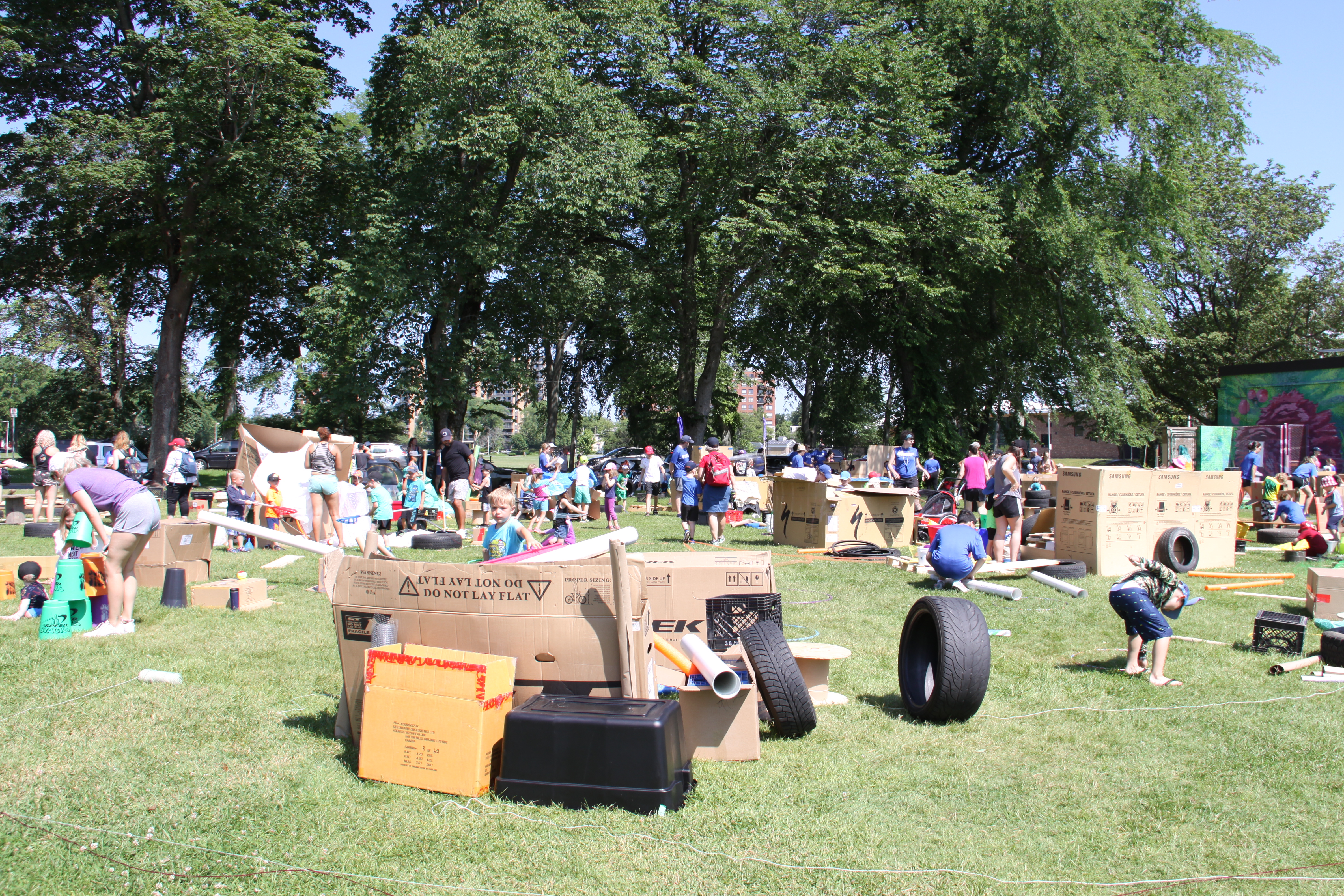 We arrived at the Commons on the day with a U-Haul and our cars packed to the rafters. We unloaded the loose parts and reassembled hundreds of cardboard boxes (the bigger the better) that had been flattened for easy storage. Our team member Alex Smith, who hosted a pop-up playground in 2017, advised us to gather as many cardboard boxes as we could and thank goodness, we took that advice. As you can see from photos the boxes were a big hit. Next, we staged the loose parts into separate areas, creating visual invitations to come and play.
