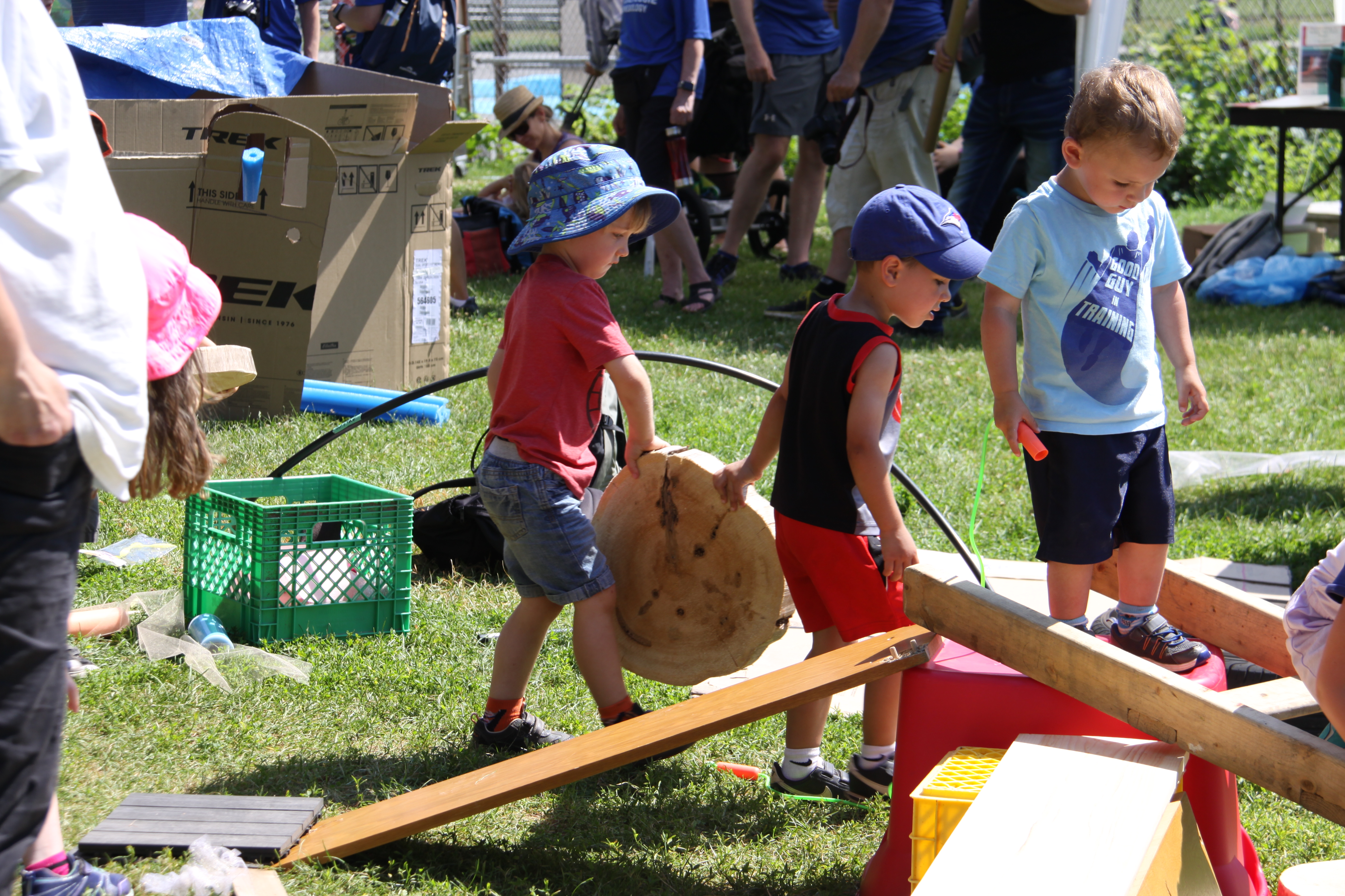 The children started to arrive wide-eyed and curious. There were toddlers, preschool and school age children and even a few infants. Some children came in groups from child care centres or day camps, and some came with caregivers or parents. Some came because they had seen the event notice, and some were driving by and stopped to see what it was all about. Some children dove right in, but some children were a bit hesitant. Message to the children, โplay and have fun.โ Message to the adults, โThe beauty lies in allowing the children the freedom to explore the materials, use them as they wish, and take them to any area of the play area they feel the need to.โ