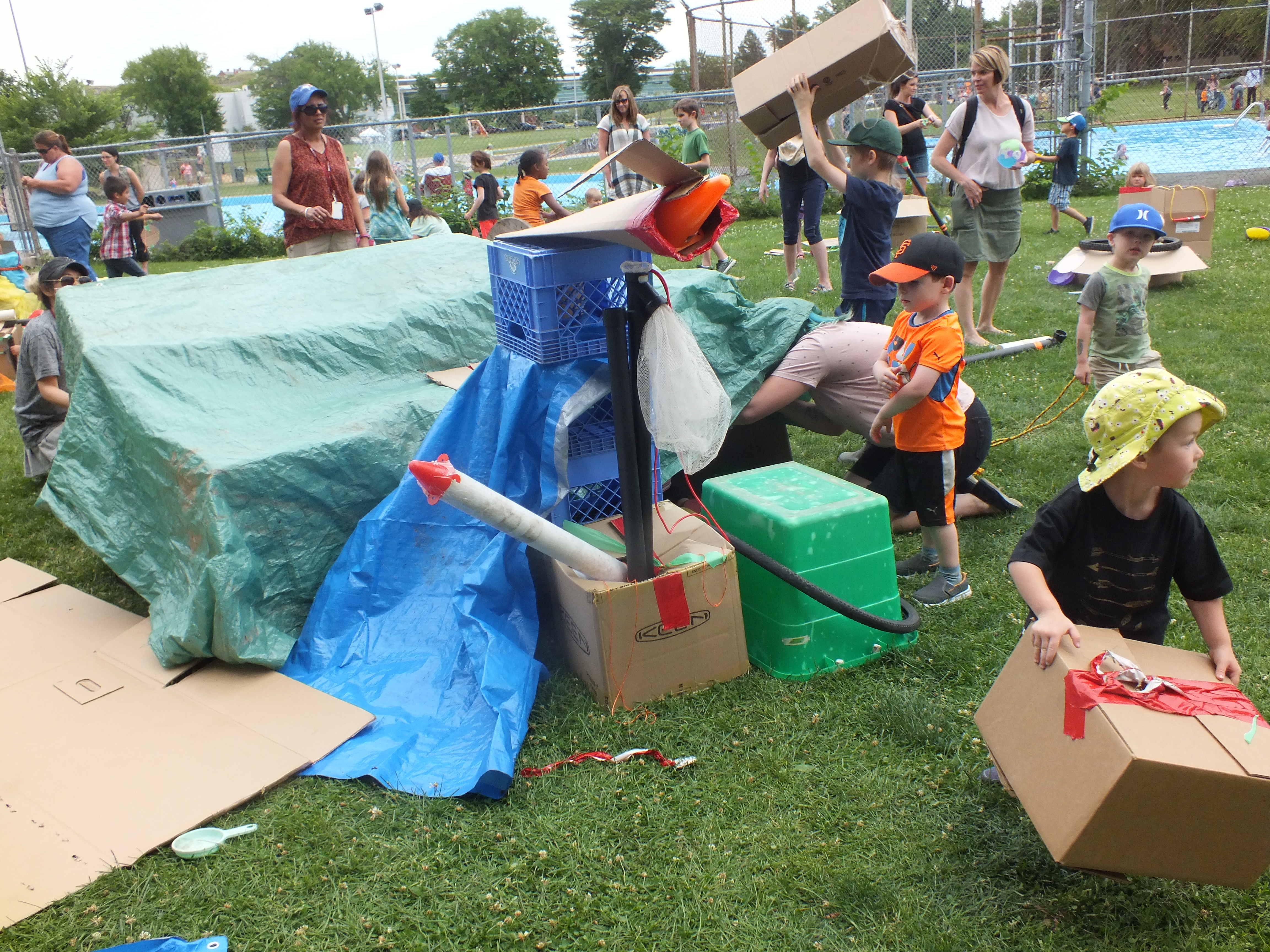 The children started to arrive wide-eyed and curious. There were toddlers, preschool and school age children and even a few infants. Some children came in groups from child care centres or day camps, and some came with caregivers or parents. Some came because they had seen the event notice, and some were driving by and stopped to see what it was all about. Some children dove right in, but some children were a bit hesitant. Message to the children, โplay and have fun.โ Message to the adults, โThe beauty lies in allowing the children the freedom to explore the materials, use them as they wish, and take them to any area of the play area they feel the need to.โ